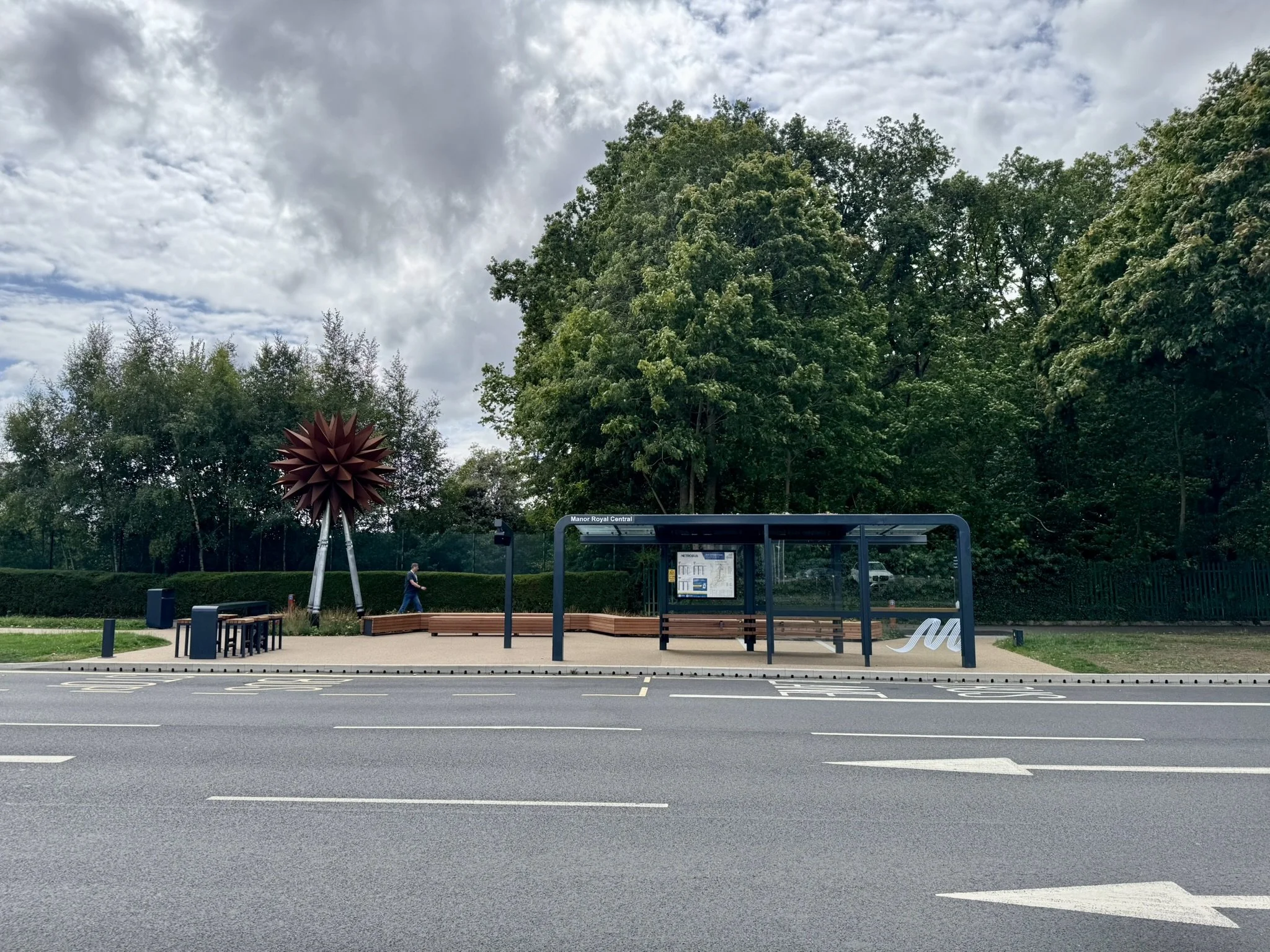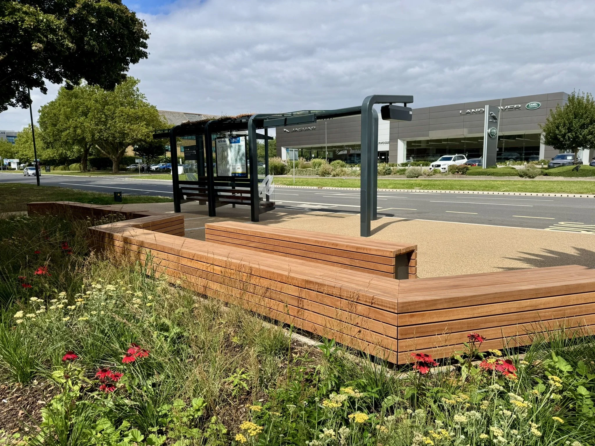 Championed by the Manor Royal Business District, the Superhub project aimed to turn uninspiring spaces into interesting and usable places, combining more inviting bus shelters with attractive public realm and complementary facilities for both bus users and the wider Manor Royal community.