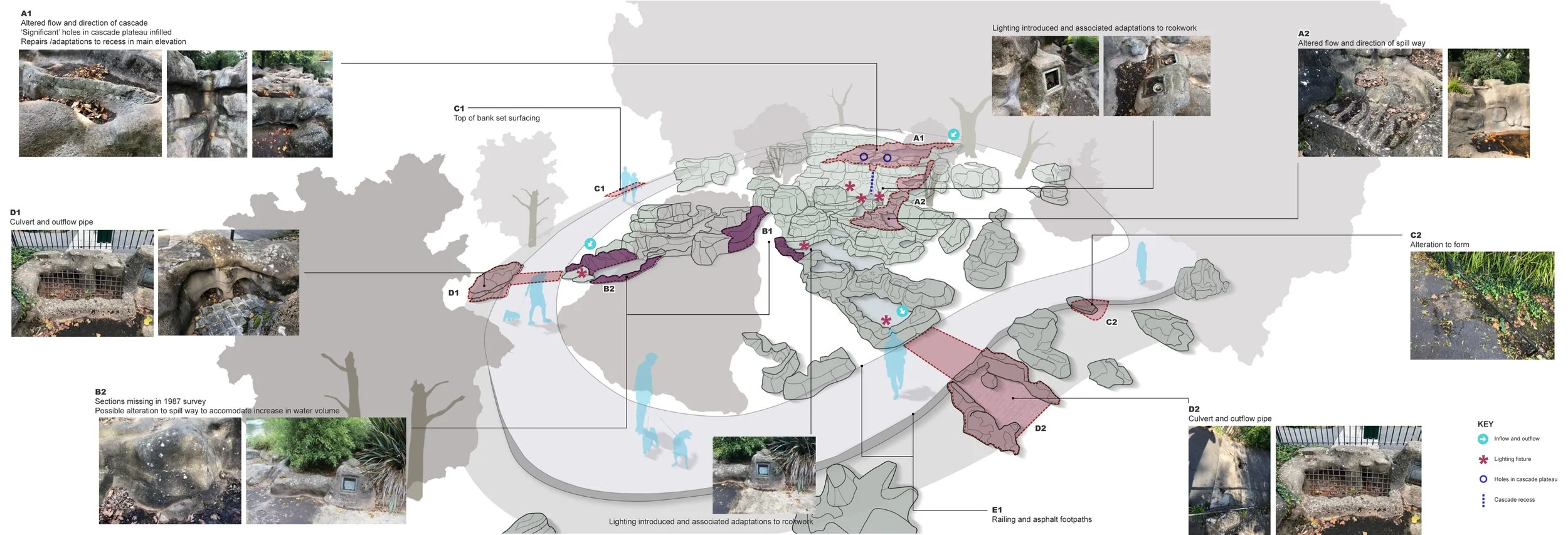 The study assessed the historical significance and current condition of the Cascades and set out recommendations for their repair and restoration. Key proposals included the removal of later gunite, structural and surface repairs, reinstatement of the water feature, repairs to lighting and hard landscape, new planting, and improvements to access and interpretation. A phased delivery strategy and cost plan were also prepared to support future funding and implementation.
